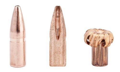 Solids are not made out of copper covered lead, but instead can be anything from entirely copper to machined bronze. They are frequently used when bullets need to conserve mass and not fragment when hitting a target. Also, they are a common choice when hunting with lead bullets is not allowed. The cutting edge of these designs are used for extreme long-range shooting, when consistency is close to a “money is no object” kind of endeavor.
